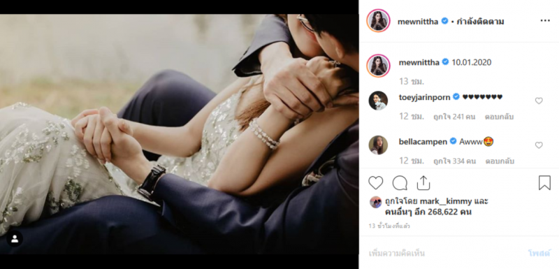 ก่อนหน้านี้มิวก็ได้พูดถึงเรื่องราวการเตรียมดูไว้แล้วว่าจะอลังการแค่ไหน ทั้งเรื่องชุด สถานที่จัดงานแต่ง รวมถึงล็อกคิวเพื่อนๆแก๊งเฟอร์บี้ไว้แล้ว งานนี้มีแต่คนอยากรู้ว่าภาพเซ็ทนี้ใช่ภาพพรีเวดดิ้งหรือไม่ แต่ที่แน่ๆ ความหวานของคู่มิว เห็นได้ชัดเลยหลังจากประกาศข่าวดีกำลังจะเป็นว่าที่เจ้าสาว เราไปดูภาพนั้นกันเลยนะคะ