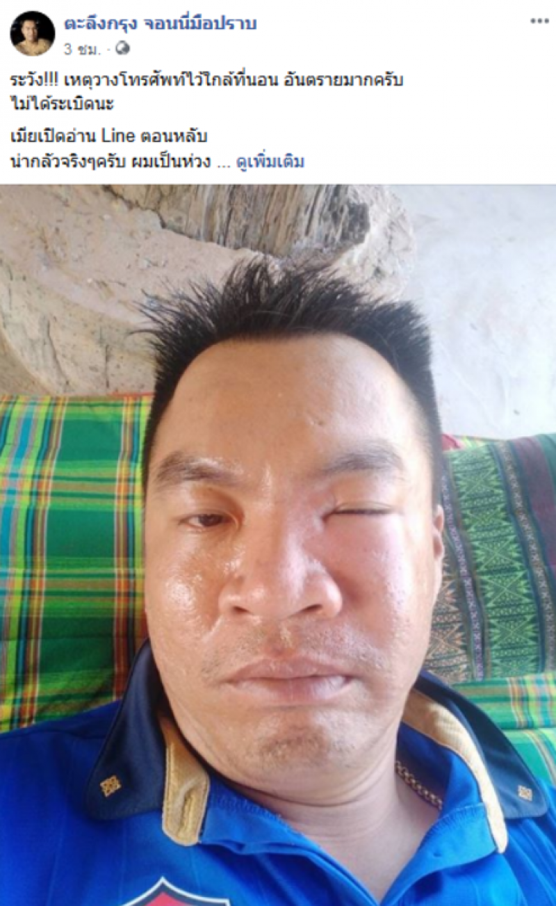 โดยได้ระบุข้อความว่า ระวัง เหตุวางโทรศัพท์ไว้ใกล้ที่นอน น่ากลัวมากครับ ไม่ใช่อะไรนะ เมียเปิดอ่าน Line ตอนหลับ น่ากลัวจริงๆครับ ผมเป็นห่วง