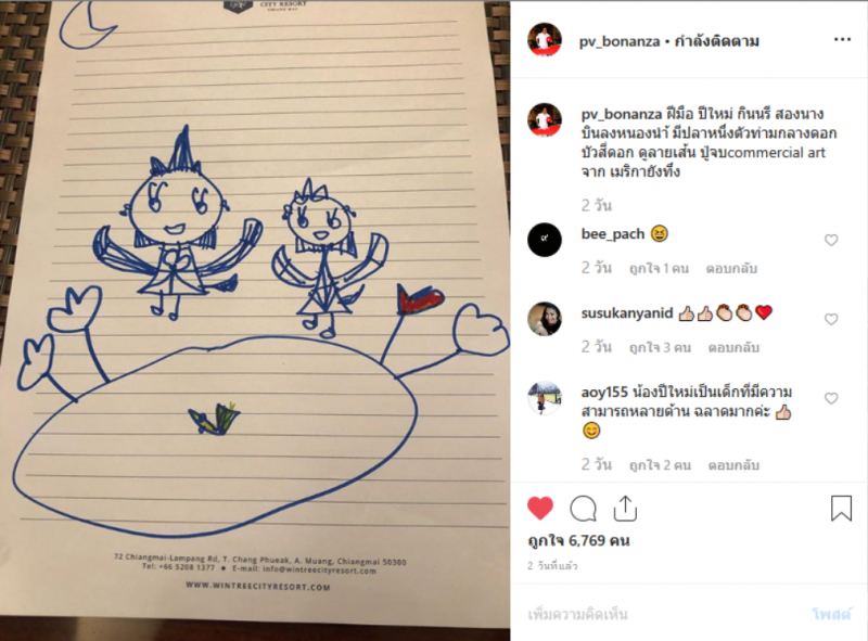 อย่างล่าสุด วันที่ 12 พฤศจิกายน 2562 คุณปู่ไพบูลย์ ก็เพิ่งออกมาเผยฝีมือการวาดภาพของ น้องปีใหม่ ในอินสตาแกรมส่วนตัว พร้อมระบุข้อความว่า ภาพนี้เป็นภาพของกินนรีสองนาง กำลังบินร่อนลงสู่หนองน้ำ ซึ่งในหนองน้ำนั้นมีปลา 1 ตัว ท่ามกลางดอกบัว 4 ดอก ทำเอาคุณปู่อดชื่นชมจินตนาการและฝีมือของหลานสาวไม่ได้ แถมยังชื่นชม น้องปีใหม่ ด้วยว่า ดูจากลายเส้น ขนาดคุณปู่ที่จบ Commercial art จากอเมริกา ยังทึ่งกับฝีมือของหลานรักมาก