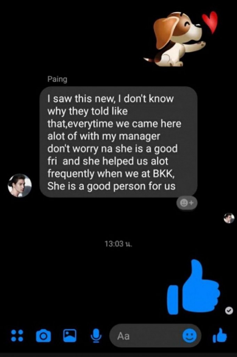 ต่อมาได้มีภาพข้อความที่คาดว่าจะเป็นของนายแบบหล่อล่ำ ไป่ ทาคน ส่งข้อความมาว่า I saw this new I don t know wht they told like that, everytime me came here alot of with my manager don t worry na she is a good fri and she helped us alot frequently when we at BKK She is a good person for us