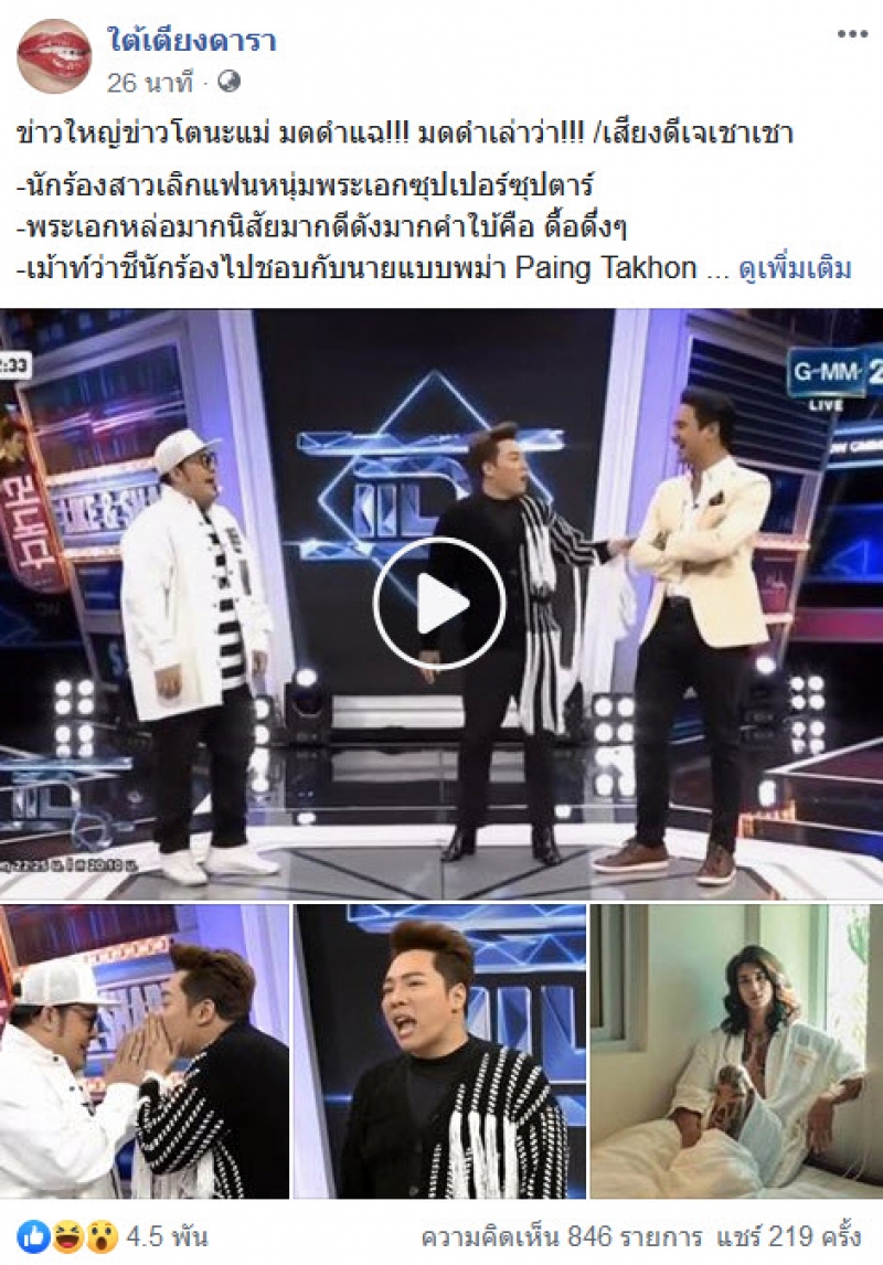 ด้าน เพจ ใต้เตียงดารา โพสต์ข้อความว่า ข่าวใหญ่ข่าวโตนะแม่ มดดำแฉ มดดำเล่าว่า เสียงดีเจเชาเชา นักร้องสาวเลิกแฟนหนุ่มพระเอกซุปเปอร์ซุปตาร์-พระเอกหล่อมากนิสัยมากดีดังมากคำใบ้คือ ดื้อดึ่งๆ เม้าท์ว่าชีนักร้องไปชอบกับนายแบบพม่า Paing Takhonนกก็เลยไปเผือกมาแล้วค่ะพี่ตาาา ว่าคู่นี้เค้าเคยร่วมงานถ่ายแบบกันมาก่อน ก็เลยเป็นเพื่อนกั๊น แต่ยังไม่ได้กิ๊กกั๊กอะไรกันนะ เพราะอีกวงเม้าท์ว่าผู้หญิงยังไม่ได้เลิกกับพระเอกซุปตาร์ เชื่อวงไหนดีอะแม่ งงไปหมด รอจ่อไมค์สัมละกันโน๊ะ ใต้พระเอกดื้อดึ่ง ใต้นายแบบพม่า ใต้นักร้องสาว ใต้เลิกไม่เลิก