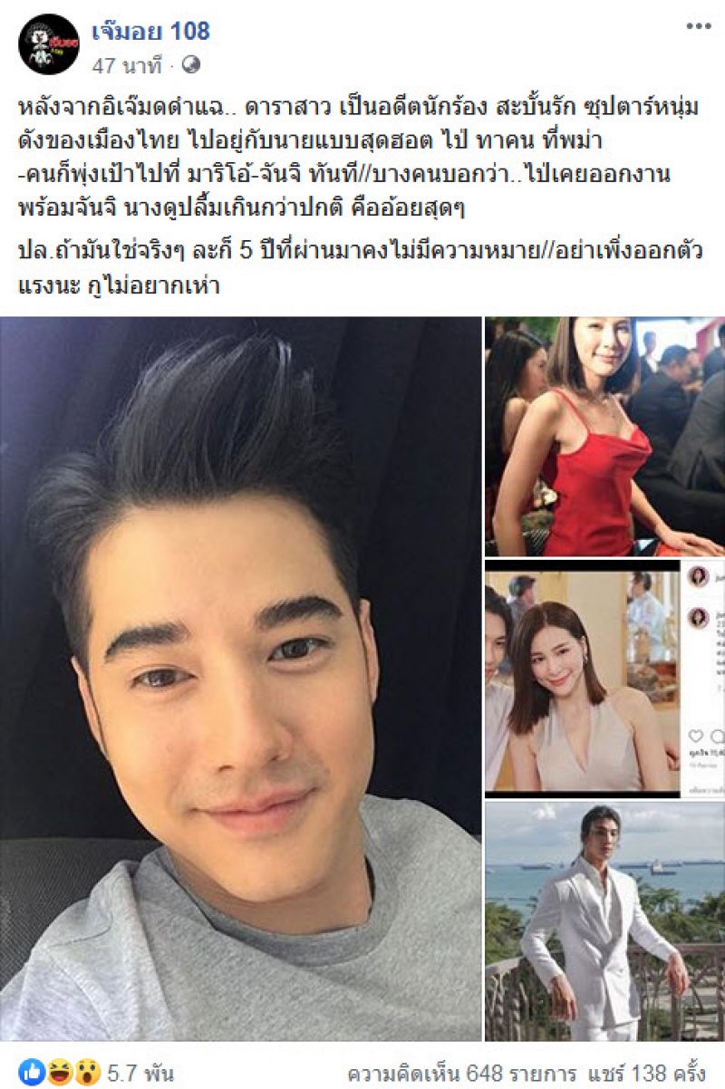 จากกรณีในเพจ เจ๊มอย 108 โพสต์ข้อความระบุว่า หลังจากอิเจ๊มดดำแฉดาราสาว เป็นอดีตนักร้อง สะบั้นรัก ซุปตาร์หนุ่มดังของเมืองไทย ไปอยู่กับนายแบบสุดฮอต ไป่ ทาคน ที่พม่า คนก็พุ่งเป้าไปที่ มาริโอ้ จันจิ ทันที บางคนบอกว่า ไป่เคยออกงานพร้อมจันจิ นางดูปลื้มเกินกว่าปกติ คืออ้อยสุดๆ ปล.ถ้ามันใช่จริงๆ ละก็ 5 ปีที่ผ่านมาคงไม่มีความหมาย อย่าเพิ่งออกตัวแรงนะ กูไม่อยากเห่า