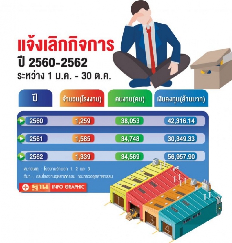 ปี 2562 เป็นอีกหนึ่งปีที่เราได้เห็นภาวะเศรษฐกิจของไทยเราถอยลงไปเยอะมาก และส่งผลกระทบให้กับหลายๆอาชีพ ทั้งเจ้าของกิจการ ลูกจ้าง รวมทั้งโรงงานอุตสาหกรรมต่างๆที่ต้องปิดกิจการ ลอยแพพนักงานเยอะมากๆ โดยล่าสุดทาง กรมโรงงานอุตสาหกรรม เปิดเผยสถิติการแจ้งเลิกประกอบกิจการโรงงาน และจำหน่ายทะเบียนโรงงาน ในช่วง 10 เดือนแรกของปี 2562 เดือนมกราคม ถึง ตุลาคม 2562 พบว่ามีโรงงานที่แจ้งยกเลิกประกอบกิจการ และจำหน่ายทะเบียนโรงงาน รวมทั้งสิ้น 1989 แห่ง โดยมีจำนวนแรงงาน 49157 คน ดังนี้