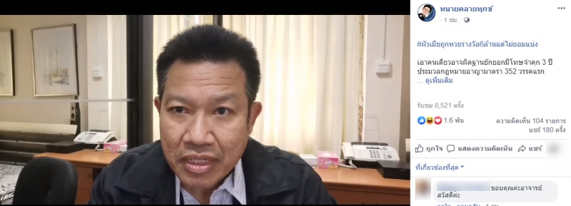 ล่าสุด ทนายเดชา กิตติวิทยานันท์ เจ้าของเพจทนายคลายทุกข์ ได้โพสต์แจงข้อกฎหมายเกี่ยวกับเรื่องนี้ว่า กรณีแบบนี้พี่น้องประชาชนก็จะถามว่าสลากเป็นของใคร ต้องดูก่อนว่า 1 จดทะเบียนสมรสหรือไม่ ถ้าไม่จดต้องดูอีกว่าใครเป็นคนซื้อคนนั้นก็เป็นเจ้าของคนเดียวล้วนๆ ถึงแม้จะเป็นผัวเมียกัน เพราะไม่ใช่เป็นการทำมาหาได้ร่วมกัน ผมเคยทำคดีแบบนี้มาแล้วที่บุรีรัมย์ อย่างที่ 2 ถ้าจดทะเบียนสมรส ทรัพย์สินอันนี้ก็เป็นสินสมรสทั้งสองฝ่ายมีส่วนเท่ากัน