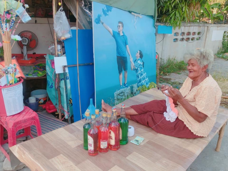 แต่พอคุยกับป้าไปๆมาๆ ป้าบอก รูปหนูหรอให้ยายรื้อไหม เอาไปเก็บไว้ลูกป้าไม่รู้จริงป้าเก็บมาทำเพิงอยู่ พอป้าพูดแบบนี้เราก็อดสงสารป้าไม่ได้ อยู่คนเดียวลูกหลานไม่มีขายน้ำมันขวดล่ะ 30 บาทเลี้ยงตัวเอง ร้านอยู่ตรงริมชล แล้วก็มีเสื้อมือถักขาย ถักหลายวันราคาไม่ถึง 300 บาท ใครว่างมาอุดหนุนป้าเพ็ญด้วยนะจ๊ะ