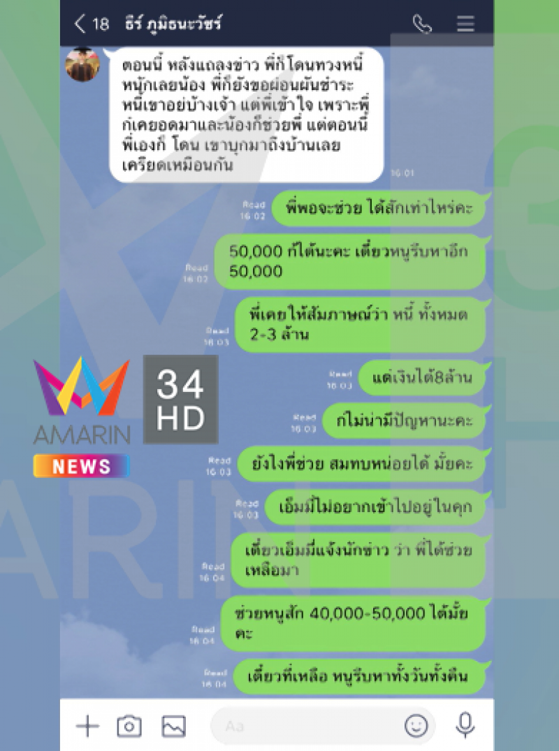 นอกจากนี้ เอ็มมี่ ยังเปิดข้อความแชทไลน์ ซึ่ง ธีร์ ปฏิเสธให้ความช่วยเหลือ พร้อมระบุตนเองก็แย่เพราะโดนบุกทวงหนี้ถึงบ้าน เข้าใจเอ็มมี่เพราะตนก็เคยผ่านจุดนั้นยากลำบากมาก่อน ด้านเอ็มมี่วอนขอให้ธีร์ช่วยในจำนวนเงิน 4 ถึง 5 หมื่นจะได้หรือไม่ ซึ่งธีร์อ่านข้อความแต่ไม่ได้ตอบอะไรกลับมาแล้ว