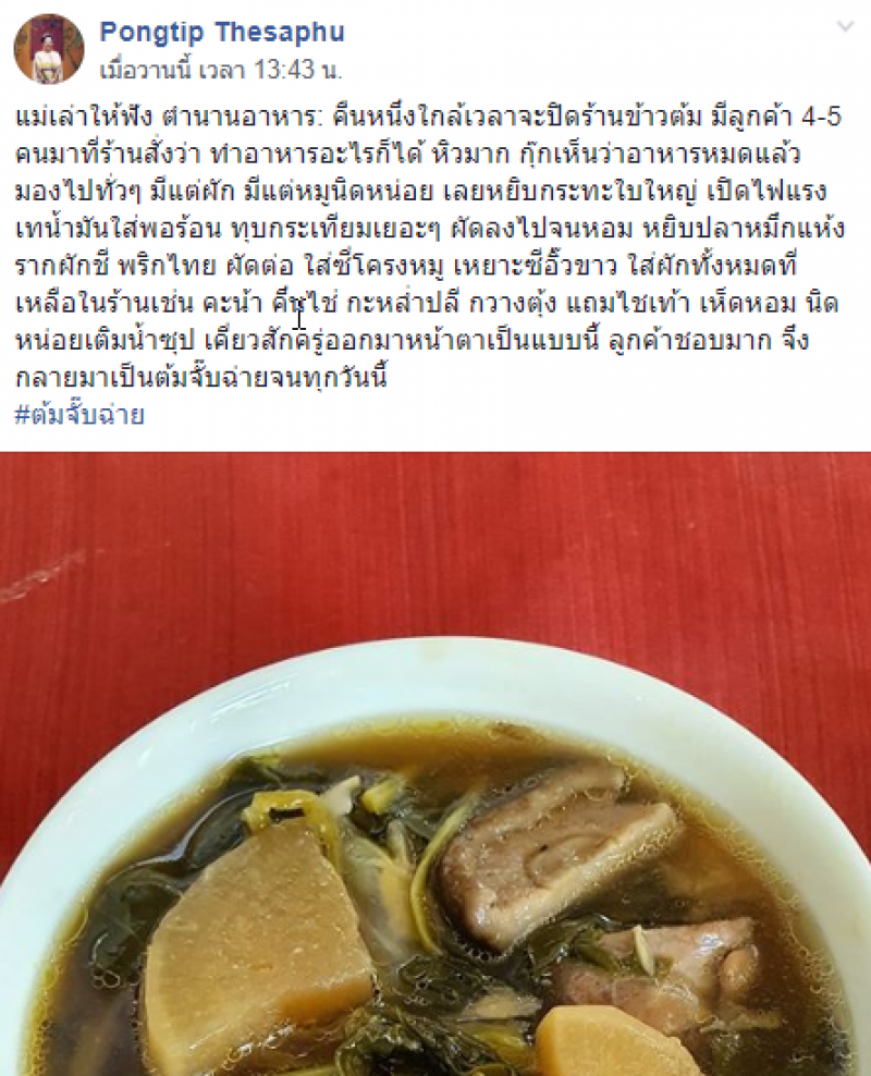 เรียกได้ว่าเป็นอีกหนึ่งเมนู ที่หลายๆคนนั้นต้องชื่นชอบเป็นอย่างมาก สำหรับ ต้มจับฉ่าย ล่าสุดมีผู้ใช้เฟสบุ๊คชื่อ Pongtip Thesaphu ได้ออกมาโพสต์ที่มาที่ไปของ ต้มจับฉ่าย โดยเธอได้ระบุข้อความว่า