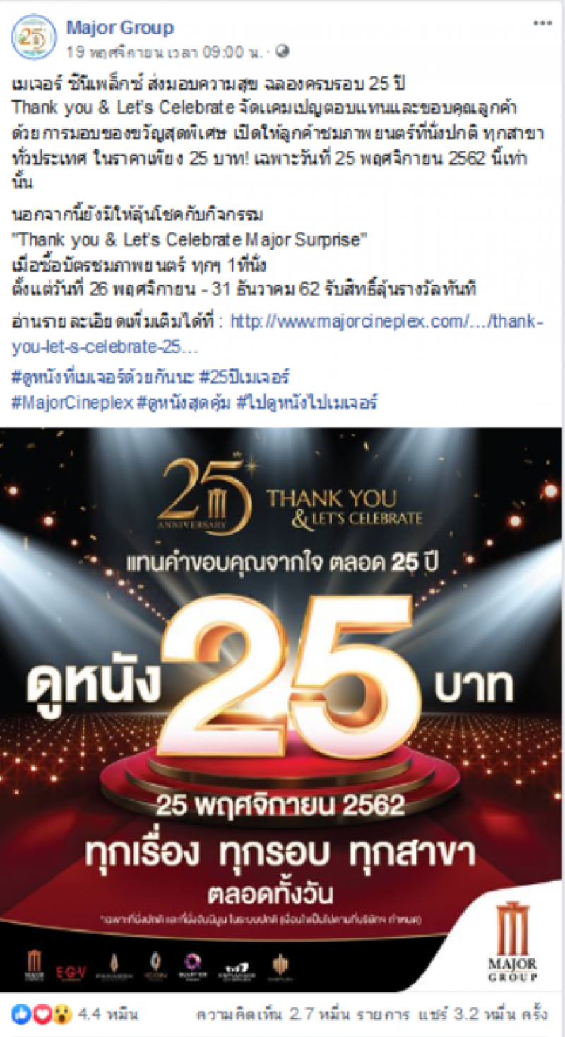ด้วยการมอบของขวัญสุดพิเศษ เปิดให้ลูกค้าชมภาพยนตร์ที่นั่งปกติ ทุกสาขาทั่วประเทศ ในราคาเพียง 25 บาท เฉพาะวันที่ 25 พฤศจิกายน 2562 นี้เท่านั้น