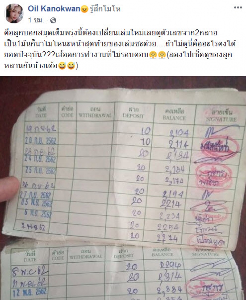คือบุตรบอกสมุดเต็มพรุ่งนี้ต้องเปลี่ยนเล่มใหม่เลยดูตัวเลขจาก2กลายเป็น1มันก็น่าโมโหนะหน้าสุดท้ายของเล่มซะด้วย ถ้าไม่ดูนี่คืออะไรคงได้ยอดปัจจุบัน เฮ้อการทำงานที่ไม่รอบคอบ ลองไปเช็คดูของลูกหลานกันบ้างเด้อ