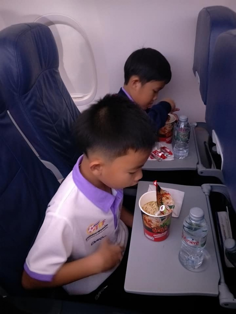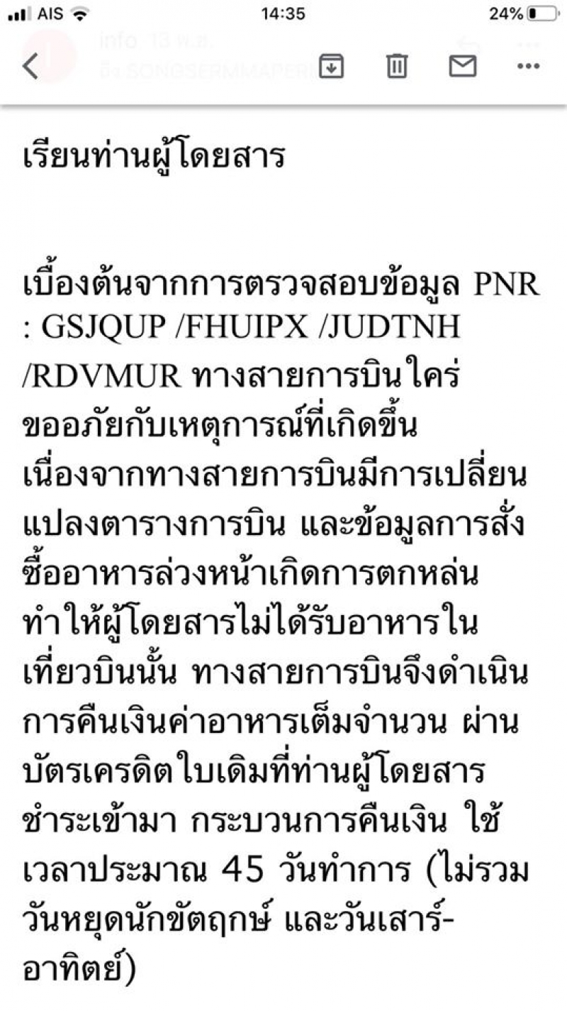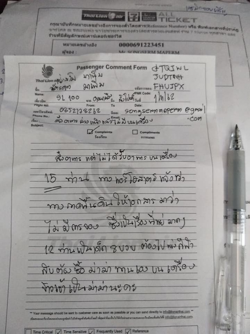 สรุปน้องแอร์บอกถึงพี่มีหลักฐานก็ไม่มีอาหารอยู่ด ผิดพลาดได้ไงวะตั้ง15คนเพราะทางภาคพื้นดินไม่มีอาหารเตรียมขึ้นมาสรุปให้ตรูและเด็กๆซื้อมาม่ากินเองบนเครื่องความผิดตรูสะที่ไหนให้ตรูจ่ายเงินซื้อเองอีก น่าสงสารลูกๆ8ขวบไปแข่งบอลกินอาหารเช้าบนเครื่องด้วย มาม่ากับน้ำร้อนเพราะใส่เครื่องไม่ได้มันเผ็ด บางคนก็ไม่กินนั่งทนไป 2ถึง 3ชม เรื่องไม่จบแค่นี้พอกลับเมืองไทยโทรไปแจ้งยุ่งยากฉิบหาย แค่เช็คตามบุ๊กกิ้งก็น่าจะรู้แล้วบอกจะโทรกลับ ตรูรอไปเป็นสิบวันโทรไปตามอีกบอกว่าจะบุกสำนักงานใหญ่เจ้าหน้าที่จึงทำหนังสือขอโทษมาบอกให้รอเงินอีก 45วัน