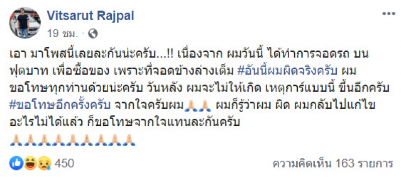 ล่าสุดหลังโดนกระแสโจมตี เจ้าตัวก็ได้ออกมาโพสต์อีกว่า มาโพสนี้เลยละกันน่ะครับ เนื่องจาก ผมวันนี้ ได้ทำการจอดรถ บนฟุตบาท เพื่อซื้อของ เพราะที่จอดข้างล่างเต็ม อันนี้ผมผิดจริงครับ ผมขอโทษทุกท่านด้วยน่ะครับ วันหลัง ผมจะไม่ให้เกิด เหตุการ์แบบนี้ ขึ้นอีกครับ ขอโทษอีกครั้งครับ จากใจครับผม ผมก็รู้ว่าผม ผิด ผมกลับไปแก้ไขอะไรไม่ได้แล้ว ก็ขอโทษจากใจแทนละกันครับ