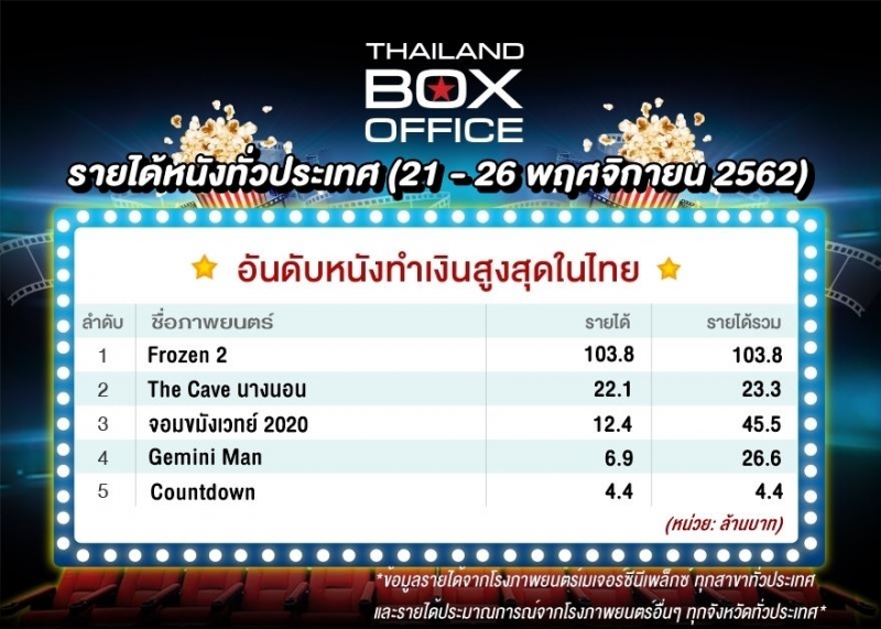 วันที่ 28 พฤศจิกายน 2562 ทีมงานสยามวาไรตี้รายงานว่า เพจเฟซบุ๊กชื่อ Thailand Box office and Entertainment ได้โพสต์ภาพของรายได้ทำเงินสูงสุดในไทย โดยเพจดังกล่าวระบุข้อความว่า อันดับหนังทำเงินสูงสุดในไทย รายได้ประจำสัปดาห์ 27 พฤศจิกายน 2562