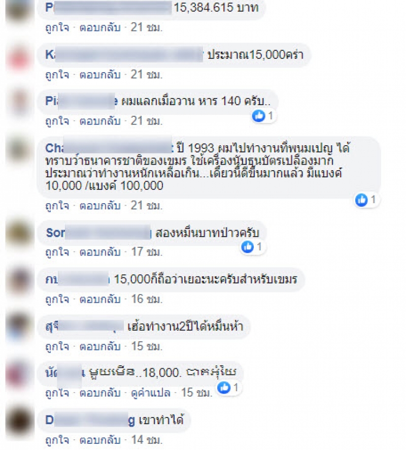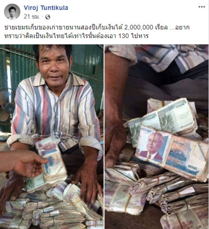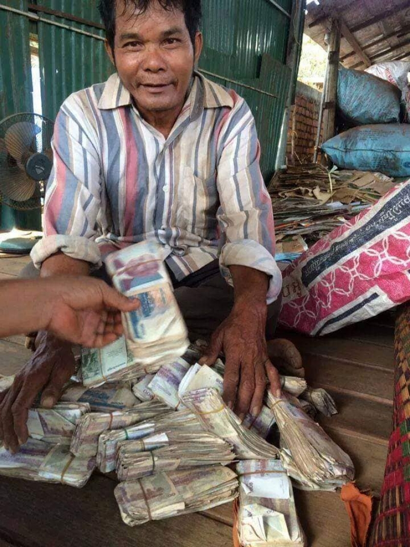 เป็นอีกหนึ่งเรื่อราวที่โซเชียลเข้ามาแสดงความเห็นกันเป็นจำนวนมาก หลังมีผู้ใช้เฟสบุ๊คชื่อ Viroj Tuntikula ได้ออกมาโพสต์ภาพของชายเก็บของเก่ารายหนึ่ง ที่ทำงานเก็บเงินมานาน 2 ปี ซึ่งเงินเก็บนั้นได้ 2000000 เรียล โดยจากโพสต์นั้นได้ระบุรายละเอียดว่า