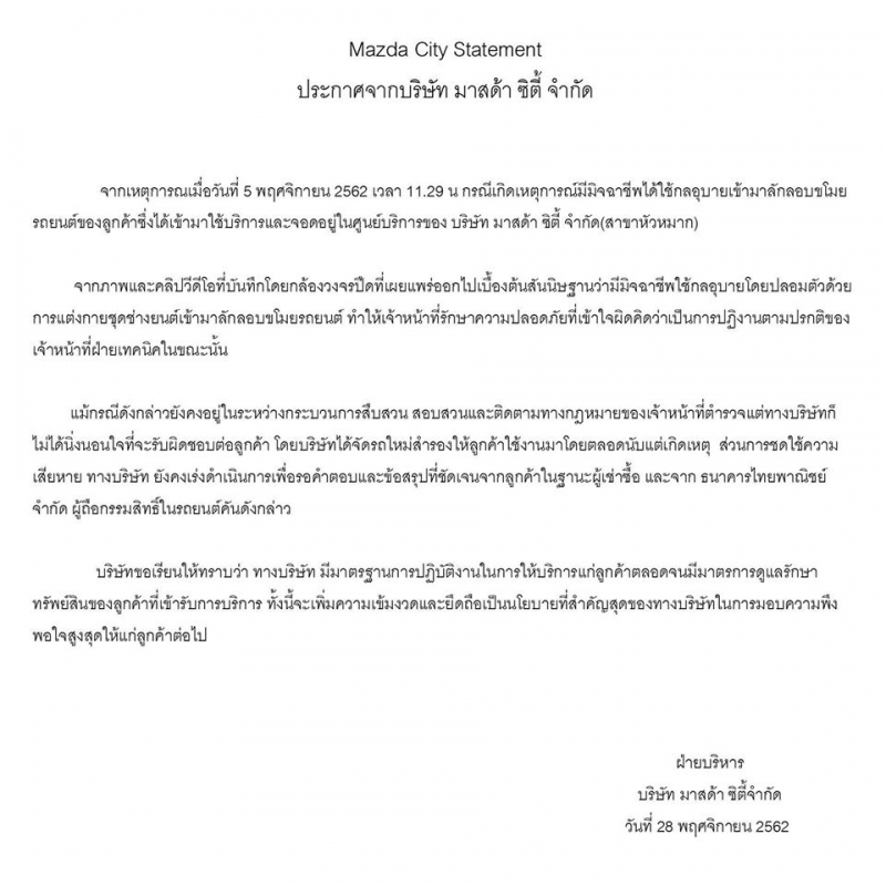 ล่าสุดนั้นในวันที่ 28 พ ย 62 ได้ประกาศแจ้งความคืบหน้า จากทางมาสด้าซิตี้ ประกาศจากบริษัท มาสด้า ซิตี้ จำกัด จากเหตุการณมือวันที่ 5 พฤศจิกายน 2562 เวลา 11 29 น กรณีเกิดเหตุการณ์มีมิจฉาชีพได้ใช้กลอุบายเข้ามาลักลอบขโมย