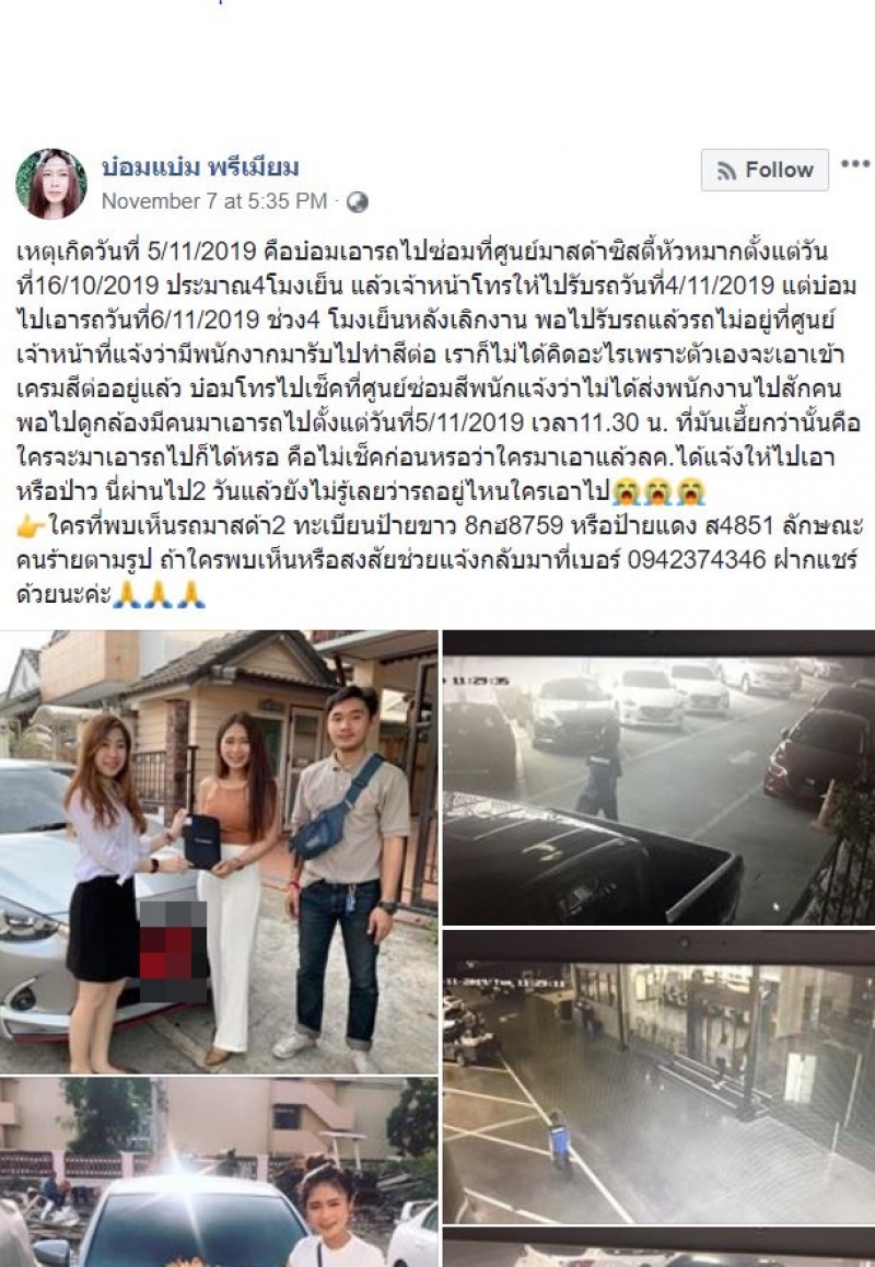 เหตุเกิดวันที่ 5 11 2019 คือบ๋อมเอารถไปซ่อมที่ศูนย์มาสด้าซิสตี้หัวหมากตั้งแต่วันที่16 10 2019 ประมาณ4โมงเย็น แล้วเจ้าหน้าโทรให้ไปรับรถวันที่4 11 2019 แต่บ๋อมไปเอารถวันที่6 11 2019 ช่วง4 โมงเย็นหลังเลิกงาน พอไปรับรถแล้วรถไม่อยู่ที่ศูนย์ เจ้าหน้าที่แจ้งว่ามีพนักงากมารับไปทำสีต่อ เราก็ไม่ได้คิดอะไรเพราะตัวเองจะเอาเข้าเครมสีต่ออยู่แล้ว บ๋อมโทรไปเช็คที่ศูนย์ซ่อมสีพนักแจ้งว่าไม่ได้ส่งพนักงานไปสักคน พอไปดูกล้องมีคนมาเอารถไปตั้งแต่วันที่5 11 2019 เวลา11 30 น ที่มากกว่านั้นคือใครจะมาเอารถไปก็ได้หรอ คือไม่เช็คก่อนหรอว่าใครมาเอาแล้วลค ได้แจ้งให้ไปเอาหรือป่าว นี่ผ่านไป2 วันแล้วยังไม่รู้เลยว่ารถอยู่ไหนใครเอาไป