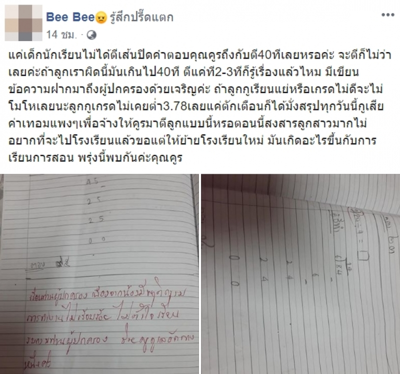 เป้นอีกหนึ่งเรื่องราวที่โซเชียลเข้ามาแสดงความเห็นกันเป็นจำนวนมาก หลังมีผู้ใช้เฟสบุ๊คชื่อ Bee Bee โพสต์ภาพเล่าเรื่องราวเหตุการณ์ลูกสาวโดนคุณครูที่โรงเรียนทำโทษถึง 40 ครั้ง โดยได้ระบุข้อความว่า