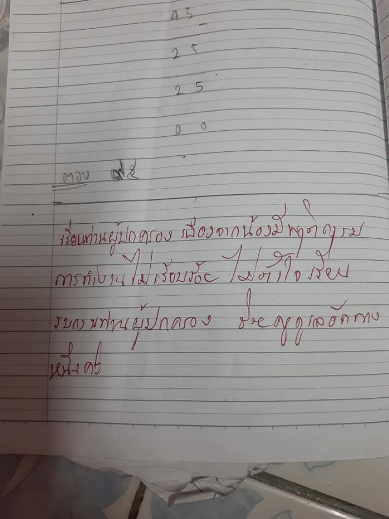 แม่โมโหหนัก ลูกสาวถูกครูทำโทษ 40 ครั้ง เพียงแค่ไม่ขีดเส้นใต้ แถมยังเขียนข้อความฝากถึงผู้ปกครอง