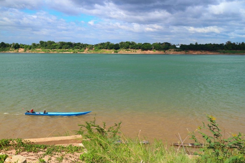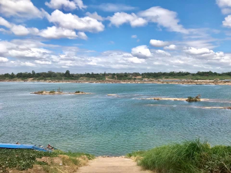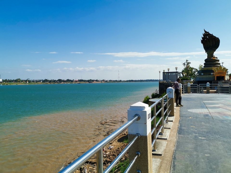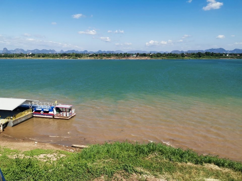 ฝั่งที่เป็นสีฟ้าเกิดจาก น้ำโขงหิวตะกอน