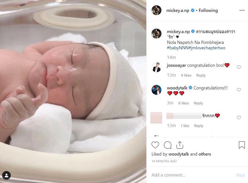ขณะที่คุณสามี มิกกี้ นนท์ อัลภาชน์ ณ ป้อมเพชร ก็ได้โพสต์ภาพของบุตรสาว พร้อมแคปชั่นเดียวกันลง IG พร้อมแท็ก babyNNN ซึ่งเป็นอักษรย่อของชื่อบุตร โดย NNN ย่อมาจาก Nola Napetch Na Pombhejara นั่นเองจ้า