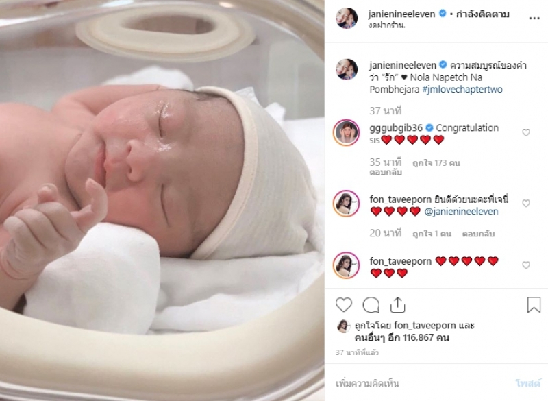 ยินดีด้วยจ้า เจนี่ ให้กำเนิด น้อง Nola น่าเอ็นดูมากๆ หลังจากที่ปล่อยให้หลายคนสงสัยว่านางเอกสาว เจนี่ อัลภาชน์ ณ ป้อมเพชร มีเบบี้2คนหรือไม่ วันนี้ก็ได้คำตอบที่ทำให้ทุกคนหายสงสัยแล้ว เมื่อสาวเจนี่ คุณแม่มือใหม่ และมิกกี้ คุณพ่อป้ายแดง ได้โพสต์รูปเบบี้ลงอินสตาแกรมของตัวเอง พร้อมแคปชั่นเหมือนกันว่า ความสมบูรณ์ของคำว่า รัก hearts Nola Napetch Na Pombhejara jmlovechaptertwo