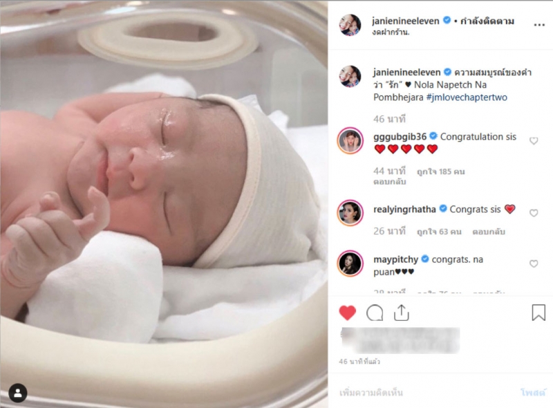 เรียกได้ว่าทำเอาแฟนๆ แห่แสดงความยินดีกันเป็นจำนวนมาก สำหรับ คุณพ่อคุณแม่ป้ายแดงอย่าง เจนี่ อัลภาชน์ ณ ป้อมเพชร และ นนท์ อัลภาชน์ ณ ป้อมเพชร หลังได้ให้กำเนิดบุตรคนแรกแล้วเป็นที่เรียบร้อย โดยสาวเจนี่ ยังได้ออกมาโพสต์ภาพ พร้อมระบุข้อความว่า ความสมบูรณ์ของคำว่า รัก Nola Napetch Na Pombhejara jmlovechaptertwo
