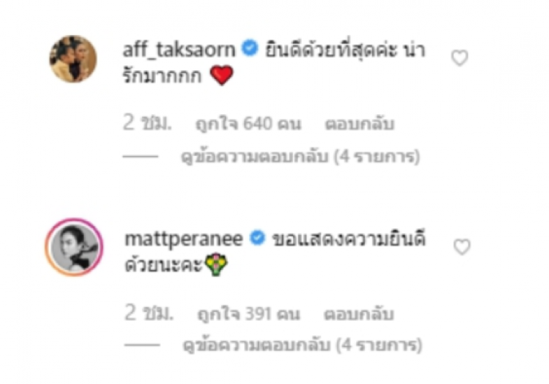 ล่าสุดโดยงานนี้ก็เหล่าบรรดาเพื่อนร่วมวงการแห่มาแสดงความยินดีกันอย่างคับคั่งเลยทีเดียว รวมถึง แอฟ ทักษอร ภักดิ์สุขเจริญ และ แมท ภีรนีย์ คงไทย นั้นเกิดอาการใจตรงกันเข้าไปคอมเมนต์แสดงความยินดี สาวเจนี่ กลางอินสตาแกรมชนิดที่ว่าคอมเมนต์ต่อกันเลยทีเดียว