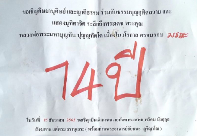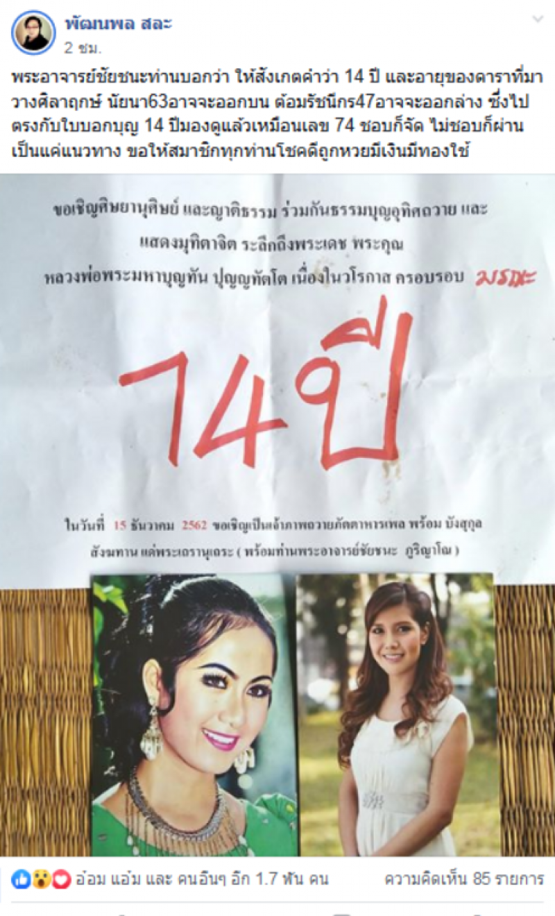 เรียกได้ว่าทำหลายๆคนฮือฮา หลัมีผุ้ใช้เฟสบุ๊คชื่อ พัฒนพล สละ ได้ออกมาโพสต์ภาพผ่านกลุ่มดัง พร้อมทั้งได้ระบุข้อความว่า พระอาจารย์ชัยชนะท่านบอกว่า ให้สังเกตคำว่า 14 ปี และอายุของดาราที่มาวางศิลาฤกษ์ นัยนา63อาจจะออกบน ต้อมรัชนีกร47อาจจะออกล่าง ซึ่งไปตรงกับใบบอกบุญ 14 ปีมองดูแล้วเหมือนเลข 74 ชอบก็จัด ไม่ชอบก็ผ่าน เป็นแค่แนวทาง