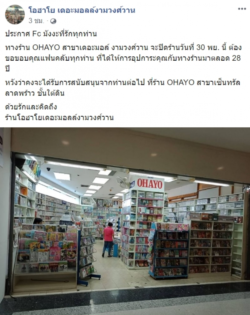 วันที่ 2 ธันวาคม 2562 ทีมงานสยามวาไรตี้รายงานว่า กรณี เพจเฟซบุ๊กโพสต์ข้อความระบุว่า ประกาศ Fc มังงะที่รักทุกท่าน ทางร้าน OHAYO สาขาเดอะมอล์ งามวงศ์วาน จะปิดร้านวันที่ 30 พย นี้ ต้องขอขอบคุณแฟนคลับทุกท่าน ที่ได้ให้การอุปการะคุณกับทางร้านมาตลอด 28 ปี หวังว่าคงจะได้รับการสนับสนุนจากท่านต่อไป ที่ร้าน OHAYO สาขาเซ็นทรัลลาดพร้าว ชั้นใต้ดิน ด้วยรักและคิดถึง ร้านโอฮาโยเดอะมอลล์งามวงศ์วาน