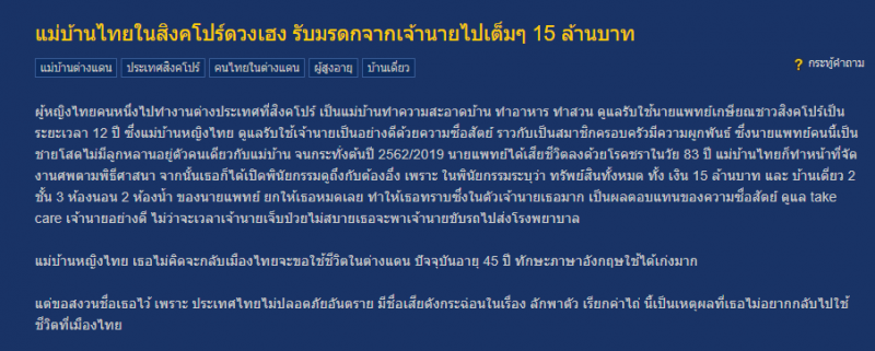 ผู้หญิงไทยคนหนึ่งไปทำงานต่างประเทศที่สิงคโปร์ เป็นแม่บ้านทำความสะอาดบ้าน ทำอาหาร ทำสวน ดูแลรับใช้นายแพทย์เกษียณชาวสิงคโปร์เป็นระยะเวลา 12 ปี ซึ่งแม่บ้านหญิงไทย ดูแลรับใช้เจ้านายเป็นอย่างดีด้วยความซื่อสัตย์ ราวกับเป็นสมาชิกครอบครัวมีความผูกพันธ์ ซึ่งนายแพทย์คนนี้เป็นชายโสดไม่มีบุตรหลานอยู่ตัวคนเดียวกับแม่บ้าน จนกระทั่งต้นปี 2562 2019 นายแพทย์ได้ลาไปในวัย 83 ปี แม่บ้านไทยก็ทำหน้าที่จัดพิธีศาสนา จากนั้นเธอก็ได้เปิดพินัยกรรมดูถึงกับต้องอึ่ง เพราะ ในพินัยกรรมระบุว่า ทรัพย์สินทั้งหมด ทั้ง เงิน 15 ล้านบาท และ บ้านเดี่ยว 2 ชั้น 3 ห้องนอน 2 ห้องน้ำ ของนายแพทย์ ยกให้เธอหมดเลย ทำให้เธอทราบซึ่งในตัวเจ้านายเธอมาก เป็นผลตอบแทนของความซื่อสัตย์ ดูแล take care เจ้านายอย่างดี