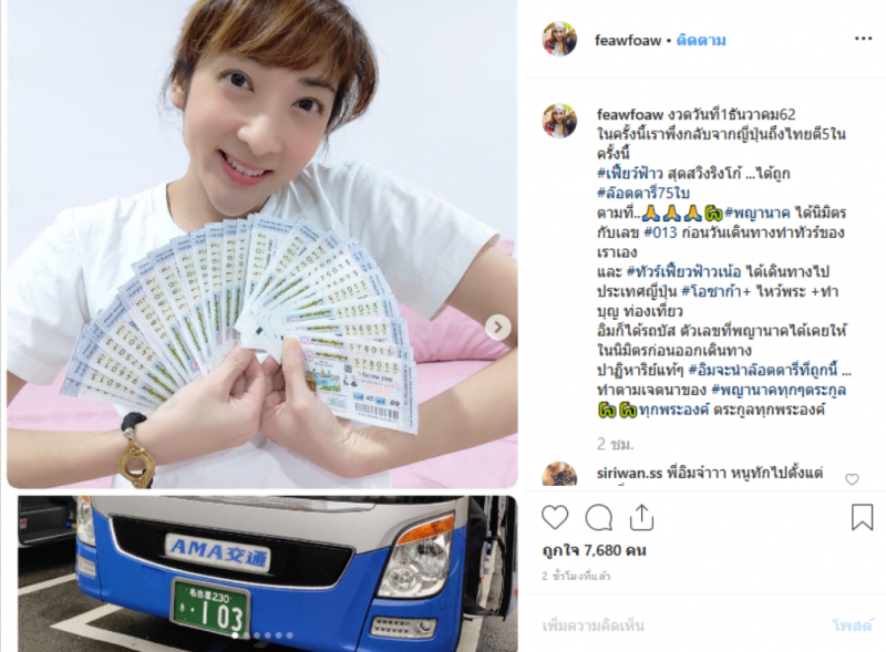 โดยเฟี้ยว์ฟ้าว เผยภาพลอตเตอรี่ 75 ใบ รางวัลเลขท้าย 3 ตัว 013 รางวัลละ 4000 บาท รวมมูลค่าแล้ว 3 แสนบาท เลข 013 ได้มาจากพญานาค ที่นิมิตรให้เห็นก่อนเดินทางไปทำทัวร์ที่ญี่ปุ่น