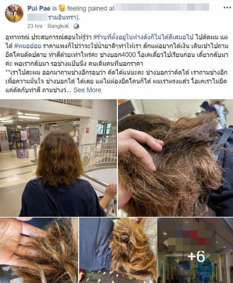 เรียกได้ว่าเป็นเรื่องราวที่คนแห่แชร์และต่างเข้ามาแสดงความคิดเห็นกันเป็นจำนวนมาก โดยสาวรายหนึ่งอุตส่าห์ลงทุนลงเงิน ไปทำผมที่ร้านในห้างดังย่านรามอินทรา เมื่อวันที่ 1 ธันวาคม 62 ที่่ผ่านมา ทำผมเบ็ดเสร็จ3500 จากปกติราคา 4พันบาท ที่ร้านเขาลดให้เพราะสาวคนดังกล่าวถามไปว่า พี่ยังจะกล้าเก็บราคาเต็ม4พันบาท อีกหรอกับภาพที่ออกมา โดยผู้ใช้เฟสบุ๊คที่ใช้ชื่อว่า Pui Pae เผยว่า อุทาหรณ์ ประสบการณ์สอนให้รู้ว่า ร้านที่ตั้งอยู่ในห้างดังก็ไม่ได้ดีเสมอไป ไปดัดผม แต่ได้ หมออ้อย ราคาแพงก็ใช่ว่าจะใช้ว่าจะดีๆทำให้เรา สักแต่อยากได้เงิน เดินเข้าไปถามยืดโคนดัดปลาย ทำสีด้วยเท่าไหร่คะ ช่างบอก4000 โอเคเดี๋ยวไปเรียนก่อน เดี๋ยวกลับมาค่ะ พอเรากลับมา รอช่างแป้บนึง คนเดิมคนที่บอกราคา