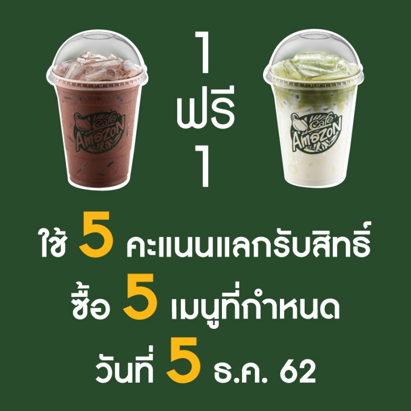ล่าสุด 5 ธค 62 เนื่องในวันพ่อแห่งชาติ 5 ธันวาคม 2562 ทาง Cafe Amazon ก็ได้จัดโปรโมชั่นดีๆ ซื้อ 1 แถม 1 จาก 5 เมนูสุดอร่อย โดยทางเพจระบุว่า