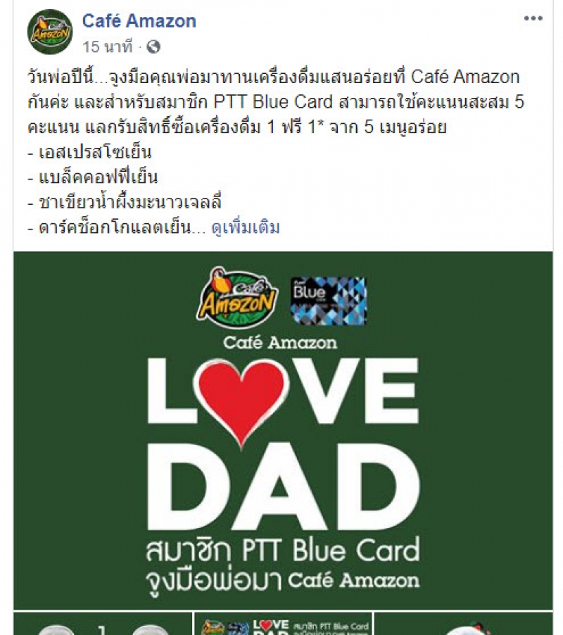 วันพ่อปีนี้ จูงมือคุณพ่อมาทานเครื่องดื่มแสนอร่อยที่ Cafe Amazon กันค่ะ และสำหรับสมาชิก PTT Blue Card สามารถใช้คะแนนสะสม 5 คะแนน แลกรับสิทธิ์ซื้อเครื่องดื่ม 1 ฟรี 1 จาก 5 เมนูอร่อย