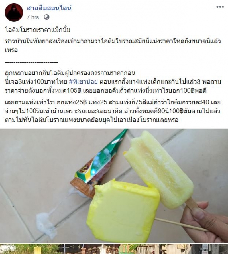เรียกได้ว่าเป็นอีกหนึ่งเรื่องราวที่โซเชียลเข้ามาแสดงความเห็นกันเยอะมากๆ หลังมีผู้ใช้เฟสบุ๊คชื่อ สายสืบออนไลนส์ ได้ออกมาโพสต์ภาพขณะซื้อไอติมโบราญ พร้อมทั้งได้ระบุข้อความว่า หลานอยากกินไอติมผู้ปกครองควรถามราคาก่อน นี่เจอ3แท่ง100บาทไทย พิกัดเขาน้อย ตอนแรกสั่งมา4แท่งเด็กแกะกินไปแล้ว3 พอถามราคาจ่ายตังบอกทั้งหมด105บาท เลยบอกขอคืนถั่วดำแท่งหนึ่งเท่าไรบอก100บาทพอดีเลยถามแท่งเท่าไรบอกแท่ง25บาท แท่ง25 สามแท่งก็75สิแม่ค้าว่าไอติมกรวยละ40 เลยจ่ายๆไป100รีบเข้าบ้านเพราะรถเยอะเลยมาคิด อ้าวทั้งหมดก็90นี่100บาทขับตามไปแล้วตามไม่ทันไอติมโบราณแพงขนาดย้อนยุคไปเอาเมืองโบราณเลยหรอ