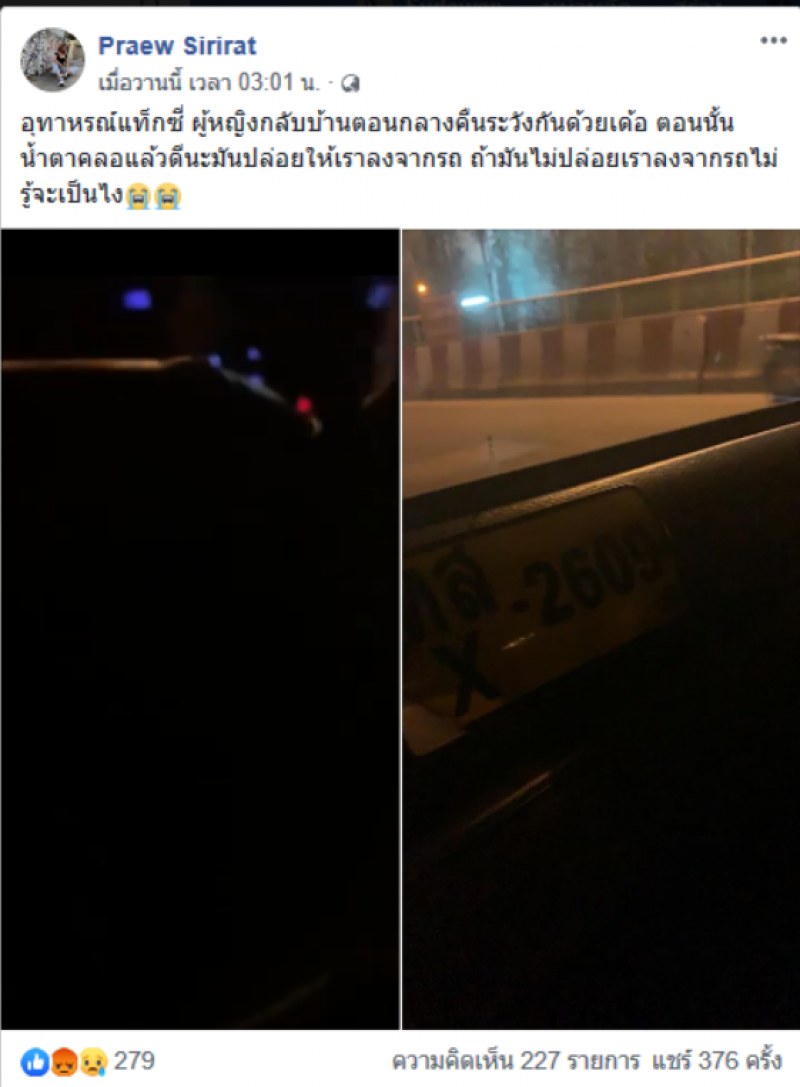 เรียกได้ว่าเป็นอีกหนึ่งเรื่องราวที่โซเชียลได้เข้ามาแสดงความคิดเห็นกันเป็นจำนวนมาก หลังมีผู้ใช้เฟสบุ๊คชื่อ Praew Sirirat ได้ออกมาโพสต์เรื่องราวโดยได้ระบุข้อความว่า อุทาหรณ์แท็กซี่ ผู้หญิงกลับบ้านตอนกลางคืนระวังกันด้วยเด้อ ตอนนั้นน้ำตาคลอแล้วดีนะมันปล่อยให้เราลงจากรถ ถ้ามันไม่ปล่อยเราลงจากรถไม่รู้จะเป็นไง โดยเรื่องดังกล่าวเป็นสาวคนหนึ่ง ขณะกำลังนั่งรถแท็กซี่คันหนึ่งเพื่อเดินทางกลับบ้าน ซึ่งระหว่างทางถูกคนขับหันมาใช้ถ้อยคำที่ไม่สุภาพ โดยเฉพาะการขอจ่ายเงินเป็นจำนวน 500 บาท แลกกับการได้ กัดหู ชองผู้โดยสารสาวคนดังกล่าว