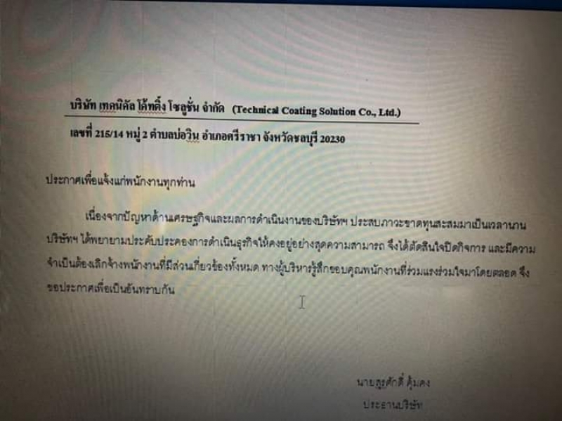 ในช่วงปี 2562 นี้หลายคนคงจะได้เห็นข่าวที่หลายๆบริษัท ประกาศปิดตัวลอยแพพนักงานไปหลายราย เนื่องจากประสบปัญหาด้านเศรษฐกิจ ล่าสุดผู้ใช้เฟซบุ๊กที่ใช้ชื่อ Ketaphol Sreewiang ได้ออกมาโพสต์ภาพจดหมายประกาศปิดกิจการ ของ บริษัท เทคนิคัล โค้ทติ้ง โซลูชั่น จำกัด ตั้งอยู่ใน ต บ่อวิน อ ศรีราชา จ ชลบุรี เป็นบริษัทเอาท์ซอร์ส รับจ้างพ่นสีพลาสติก ชิ้นส่วนเครื่องใช้ไฟฟ้า อิเล็กทรอนิกส์ ชิ้นส่วนยานยนต์ ต่างๆ สำหรับในเอกสารดังกล่าวได้ระบุข้อความโดยมีเนื้อหาดังต่อไปนี้