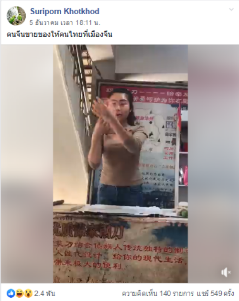 เรียกได้ว่าเป็นอีกหนึ่งคลิปที่โซเชียลเข้ามาแสดงความเห็นกันเป็นจำนมาก หลังมีผู้ใช้เฟสบุ๊คชื่อ Suriporn Khotkhod โพสต์คลิปหญิงสาวชาวจีนรายหนึ่ง ขณะกำลังยืนนำเสนอสินค้าให้กับชาวไทยที่ไปท่องเที่ยวในประเทศจีนแม่ค้าสาวชาวจีนรายหนึ่งกำลังยืนนำเสนอสินค้าให้กับคนไทย โดยพูดเป็นภาษาไทยซึ่งมีสำเนียงที่ชัดถ้อยชัดคำ แถมยังมีการปล่อยมุกตลกระหว่างการนำเสนอสินค้า จนเรียกเสียงฮาจากนักท่องเที่ยวชาวไทยได้เป็นอย่างมาก เอาเป็นว่าเราไปชมคลิปด้านล่างกันเลยดีกว่า