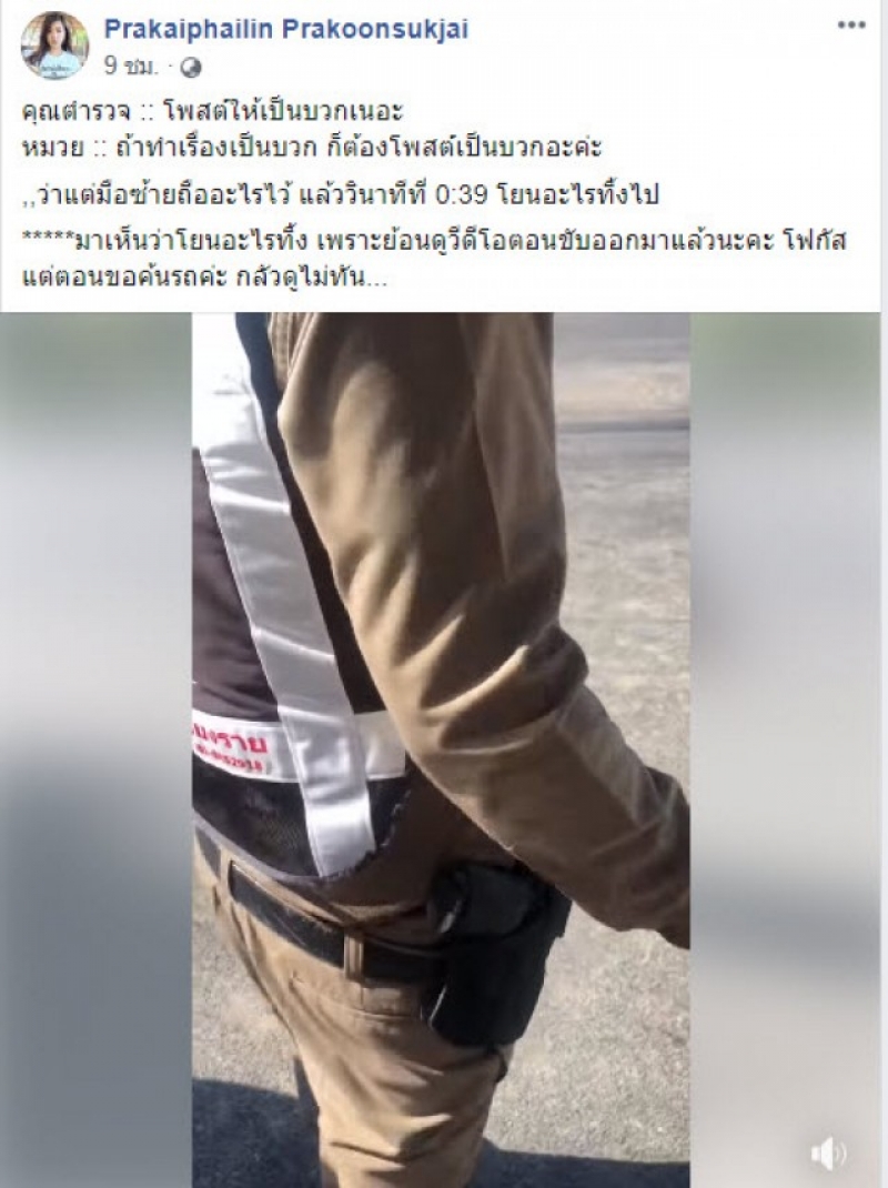 โดยคลิปดังกล่าวนั้นคนถ่ายคลิปสงสัยว่าคุณตำรวจนั้นถืออะไรอยู่ในมือก่อนที่จะโยนทิ้ง โดยเขาได้ถ่ายคลิปดังกล่าวพร้อมแคปชั่นว่า คุณตำรวจ โพสต์ให้เป็นบวกเนอะ หมวย ถ้าทำเรื่องเป็นบวก ก็ต้องโพสต์เป็นบวกอะค่ะ ว่าแต่มือซ้ายถืออะไรไว้ แล้ววินาทีที่ 0 39 โยนอะไรทิ้งไป มาเห็นว่าโยนอะไรทิ้ง เพราะย้อนดูวีดีโอตอนขับออกมาแล้วนะคะ โฟกัสแต่ตอนขอค้นรถค่ะ กลัวดูไม่ทัน