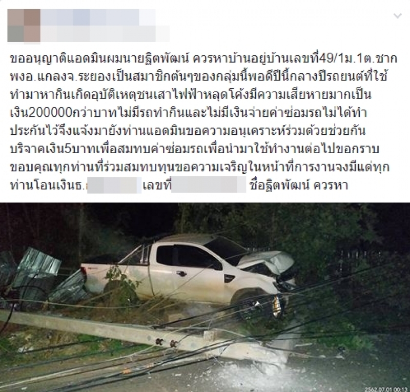 ผู้ใช้เฟซบุ๊กโพสต์ข้อความระบุว่า ขออนุญาติแอดมินผมนายฐิตพัฒน์ ควรหาบ้านอยู่บ้านเลขที่ 49ทับ1 ม1 ตำบลชากพง อำเภอแกลง จังหวัดระยอง เป็นสมาชิกต้นๆของกลุ่มนี้พอดีปีนี้กลางปีรถยนต์ที่ใช้ทำมาหากินเกิดเรื่องเหตุโดนเสาไฟฟ้าหลุดโค้งมีความเสียหายมากเป็นเงิน 200000 กว่าบาทไม่มีรถทำกินและไม่มีเงินจ่ายค่าซ่อมรถไม่ได้ทำประกันไว้จึงแจ้งมายังท่านแอดมินขอความอนุเคราะห์ร่วมด้วยช่วยกันบริจาคเงิน5บาทเพื่อสมทบค่าซ่อมรถเพื่อนำมาใช้ทำงานต่อไปขอกราบขอบคุณทุกท่านที่ร่วมสมทบทุนขอความเจริญในหน้าที่การงานจงมีแด่ทุกท่านโอนเงิน ธ xxx เลขที่xxxxxx ชื่อฐิตพัฒน์ ควรหา
