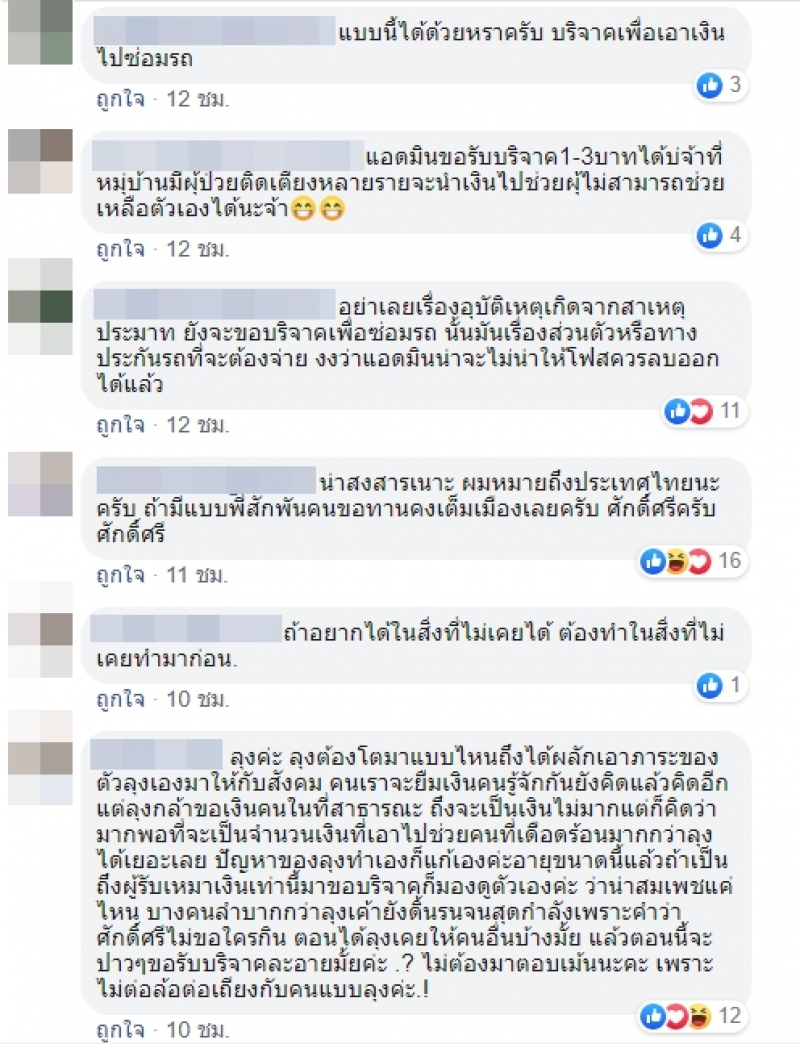 หลังจากเรื่องราวดังกล่าวถูกโพสต์ลงในโลกออนไลน์ ได้มีโซเชียลจำนวนมากเข้ามาแสดงความเห็นวิจารณ์เจ้าของโพสต์กันระงม หลังเข้ามาขอรับบริจาคเพียงเพราะจะนำเงินไปซ่อมรถ และไม่ยอมช่วยเหลือตัวเองให้ถึงที่สุดก่อน