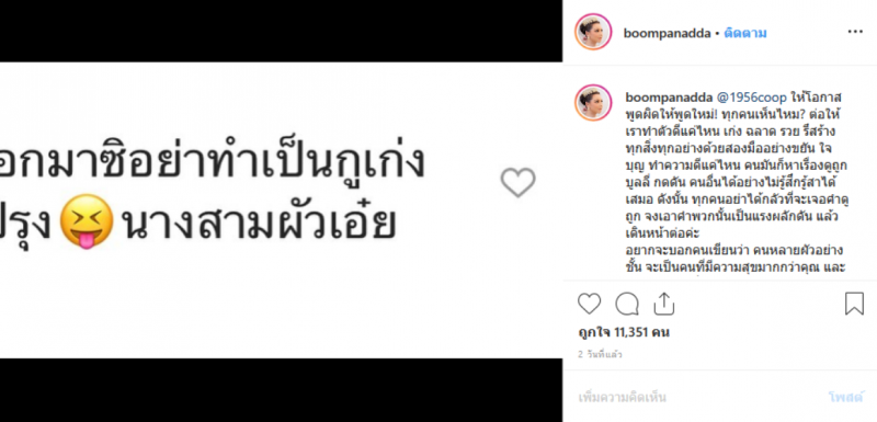 สำหรับคุณแม่สายสตรอง บุ๋ม ปนัดดา วงศ์ผู้ดี สาวเก่งมากความสามารถที่ไม่ว่าจะมีงานช่วยเหลือมูลนิธิอะไรก็ตาม เธอก็มักจะเป็นคนแรกๆที่คอยยื่นมือช่วยเหลือ ทำความดีเพื่อสังคมตลอดแต่ ล่าสุดก็มีเรื่องให้เจ้าตัวถึงกับปรี๊ด เมื่อมีโซเชียลรายหนึ่งเข้ามาคอมเมนท์ด้วยถ้อยคำไม่สุภาพ เรียกเธอว่าเป็น นางสามผัว จนบุ๋มถึงกับทนไม่ไหว แคปข้อความดังกล่าวมาโพสต์ลงบนอินสตาแกรมส่วนตัว พร้อมระบุข้อความโต้กลับว่า