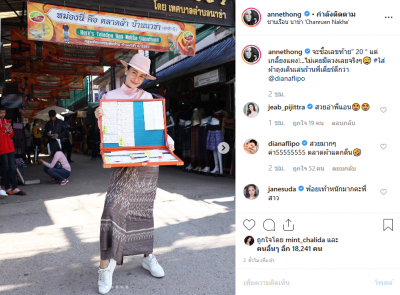 วันนี้ 10 ธันวาคม 62 แอน ทองประสม ได้บอกผ่าน IG ว่า จะซื้อเลขท้าย 20 แต่เกลี้ยงแผง ไม่เคยมีดวงเลยจริงๆ ใส่ผ้าถุงเดินเล่นร้านพี่เดียร์ดีกว่า dianaflipo แหม่ ก็ไม่รู้ว่าสาวแอนไปได้เลขนี้มาจากไหน แต่ดูท่าแล้วแฟนคลับจะตามซื้อเลข 20 กันเป็นแถวเลยละจ้า