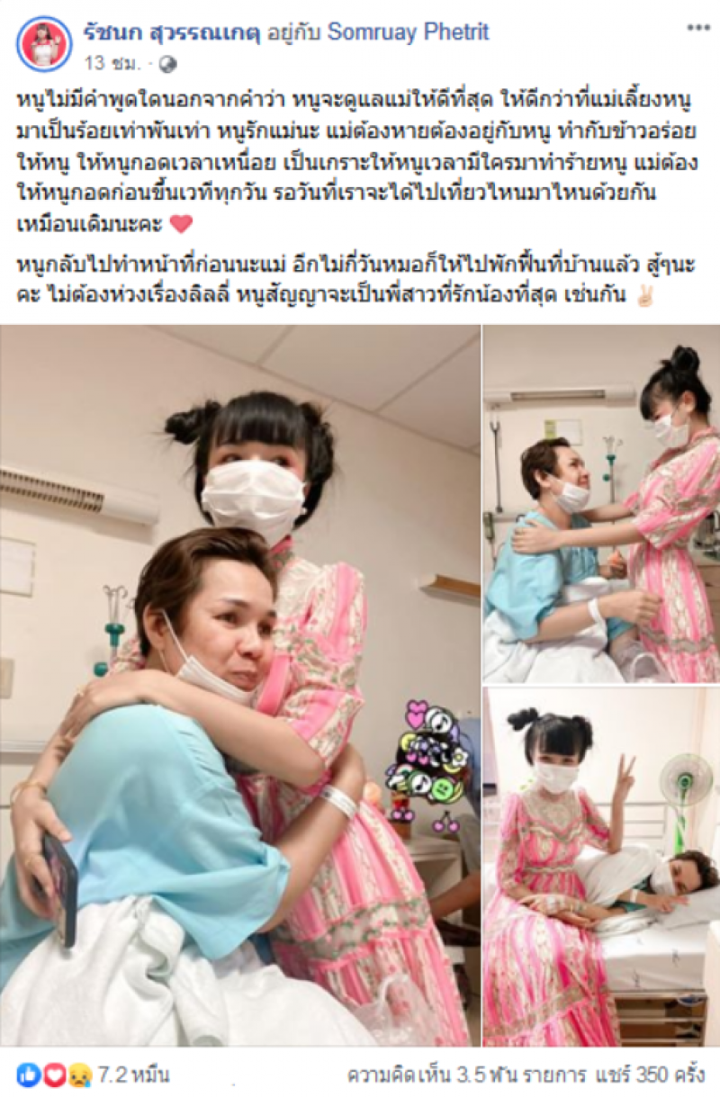 หนูไม่มีคำพูดใด นอกจากคำว่า หนูจะดูแลแม่ให้ดีที่สุด ให้ดีกว่าที่แม่เลี้ยงหนูมาเป็นร้อยเท่าพันเท่า หนูรักแม่นะ แม่ต้องหาย ต้องอยู่กับหนู ทำกับข้าวอร่อยให้หนู ให้หนูกอดเวลาเหนื่อย เป็นเกราะให้หนูเวลามีใครมาทำหนู แม่ต้องให้หนูกอดก่อนขึ้นเวทีทุกวัน รอวันที่เราจะได้ไปเที่ยวไหนมาไหนด้วยกันเหมือนเดิมนะคะ