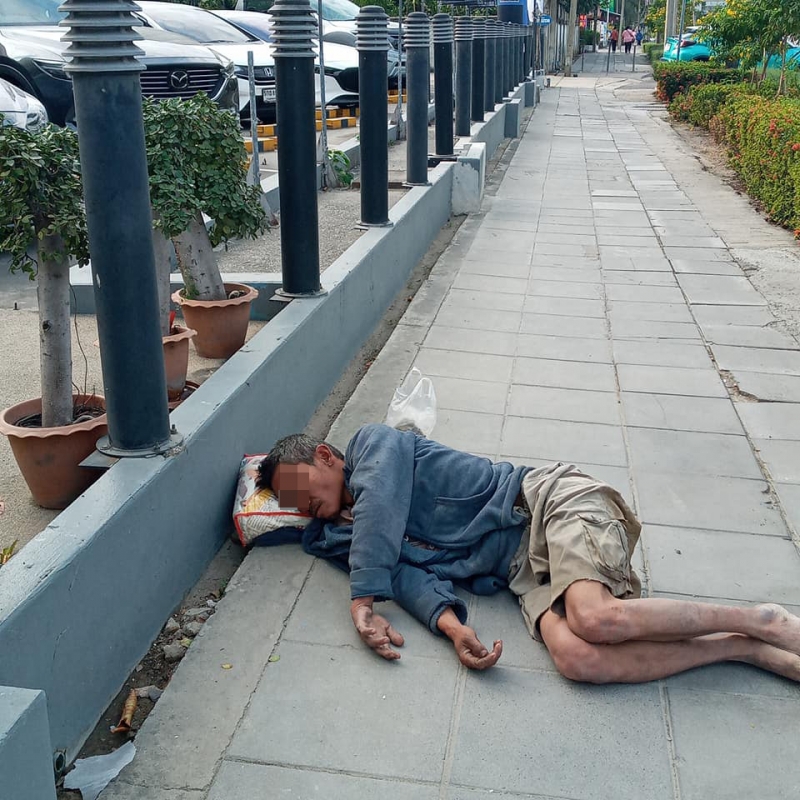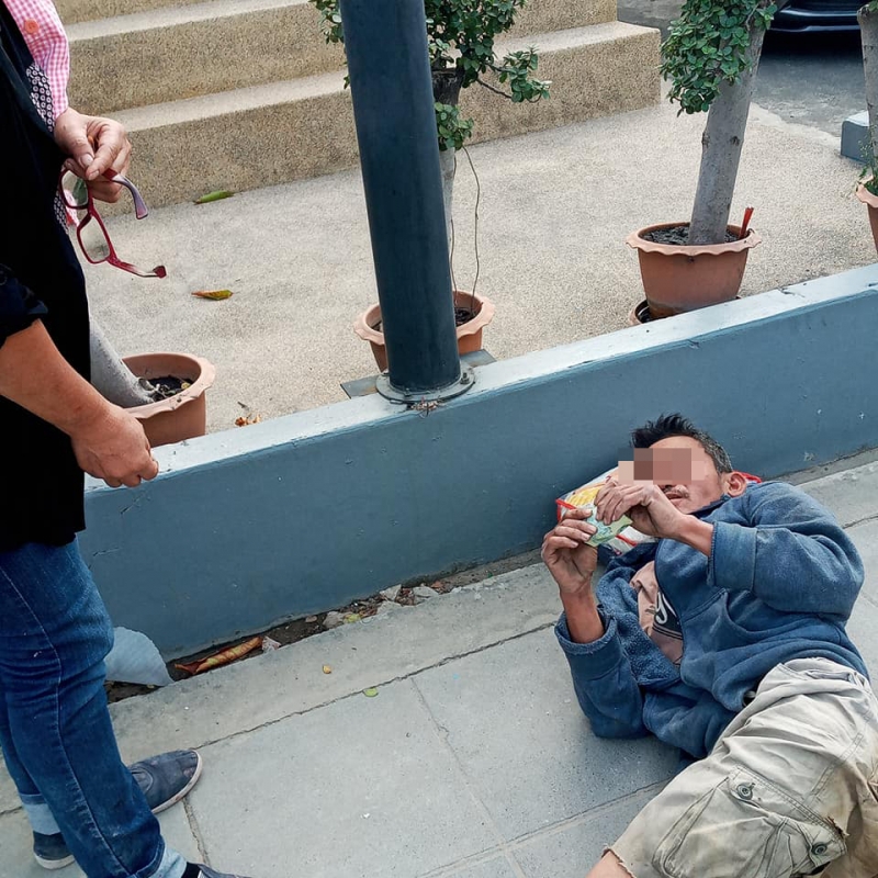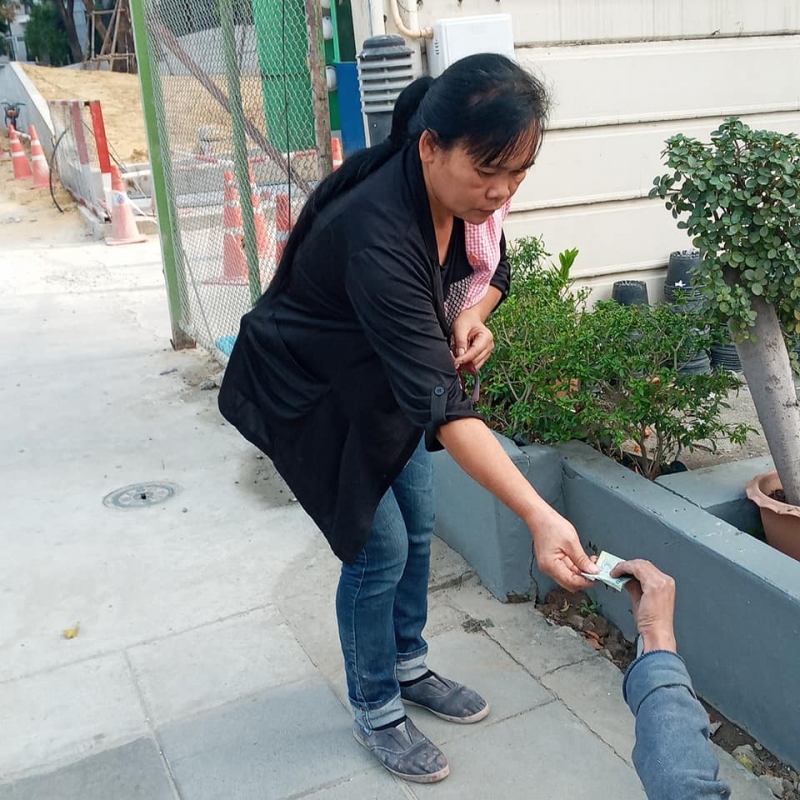 ผู้ชายคนนี้เป็นคนเร่ร่อนเขานอนอยู่ตรงนี้สองคืนสองวัน ใครๆก็คิดเหมือนกันว่าแกเมาลุกเดินไม่ไหวแต่พอถามแกก็ตอบว่าไม่สบายฉันให้เงินแกไปหกสิบบาท ในกระเป๋ามีสองร้อย แล้วฉันก็เดินเข้าไปในไซต์งานก่อสร้างแล้วเล่าให้เพื่อนๆฟังว่าแกไม่ได้ดื่มแกไม่สบายลุกนั่งหรือเดินไม่ได้เลย เดชะบุญหัวหน้างานเลยโทรแจ้งตำรวจเข้ามาตรวจสอบ