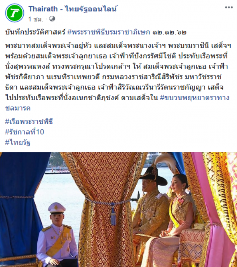 วันที่ 12 ธันวาคม 2562 ทีมงานสยามวาไรตี้รายงานว่า เพจเฟซบุ๊กไทยรัฐ ได้เผยแพร่ภาพนาทีประวัติศาสตร์ พระราชพิธีบรมราชาภิเษก โดยเพจเฟซบุ๊กดังกล่าวระบุข้อความว่า บันทึกประวัติศาสตร์ พระราชพิธีบรมราชาภิเษก 12 12 62