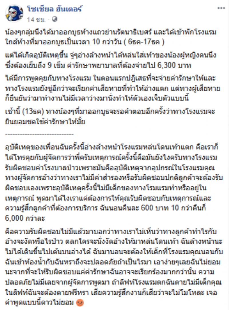 คือความรับผิดชอบไม่มีแล้วมาบอกว่าทางเราไม่เห็นว่าทางลูกค้าทำไรกับอ้างจะงัดหรือไรป่าว ตลกใครจะนั่งงัดอ้างให้มาหล่นโดนเท้า ฉันล้างหน้านะไม่ได้เดินขึ้นไปเต้นบนอ่างได้ ฉันมานอนจะต้องให้ลูกน้องที่โรงแรมคุณนอนกับฉันเข้าห้องน้ำกับฉันหราถึงจะปลอดภัยถ้าเป็นไรมา เอาง่ายๆเลยฉันไม่ยอมนะจากที่จะให้รับผิดชอบแค่ค่ารักษาฉันอาจจะเรียกร้องมากกว่านั้น ความปลอดภัยไม่มีเลยจากผู้จัดการพูดมา