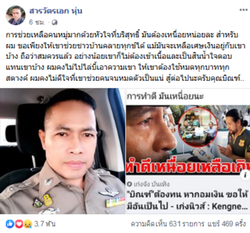ล่าสุด สารวัตรเอก หรือ พ ต ท เอกราช หุ่นงาม รอง ผกก ป สภ เมืองประจวบคีรีขันธ์ ได้โพสต์เกี่ยวกับเรื่องนี้ว่า การช่วยเหลือคนหมู่มากด้วยหัวใจที่บริสุทธิ์ มันต้องเหนื่อยหน่อยละ สำหรับผม ขอเพียงให้เขาช่วยชาวบ้านคลายทุกข์ได้ แม้มันจะเหลือเศษเงินอยู่กับเขาบ้าง ถือว่าสมควรแล้ว อย่างน้อยเขาก็ไม่ต้องเข้าเนื้อและเป็นสินน้ำใจตอบแทนเขาบ้าง ผมคงไม่ไปไล่บี้เอาความเขา ให้เขาต้องใช้หมดทุกบาททุกสตางค์ ผมคงไม่ดีใจที่เขาช่วยคนจนหมดตัวเป็นแน่ สู้ต่อไปนะครับคุณบิณฑ์
