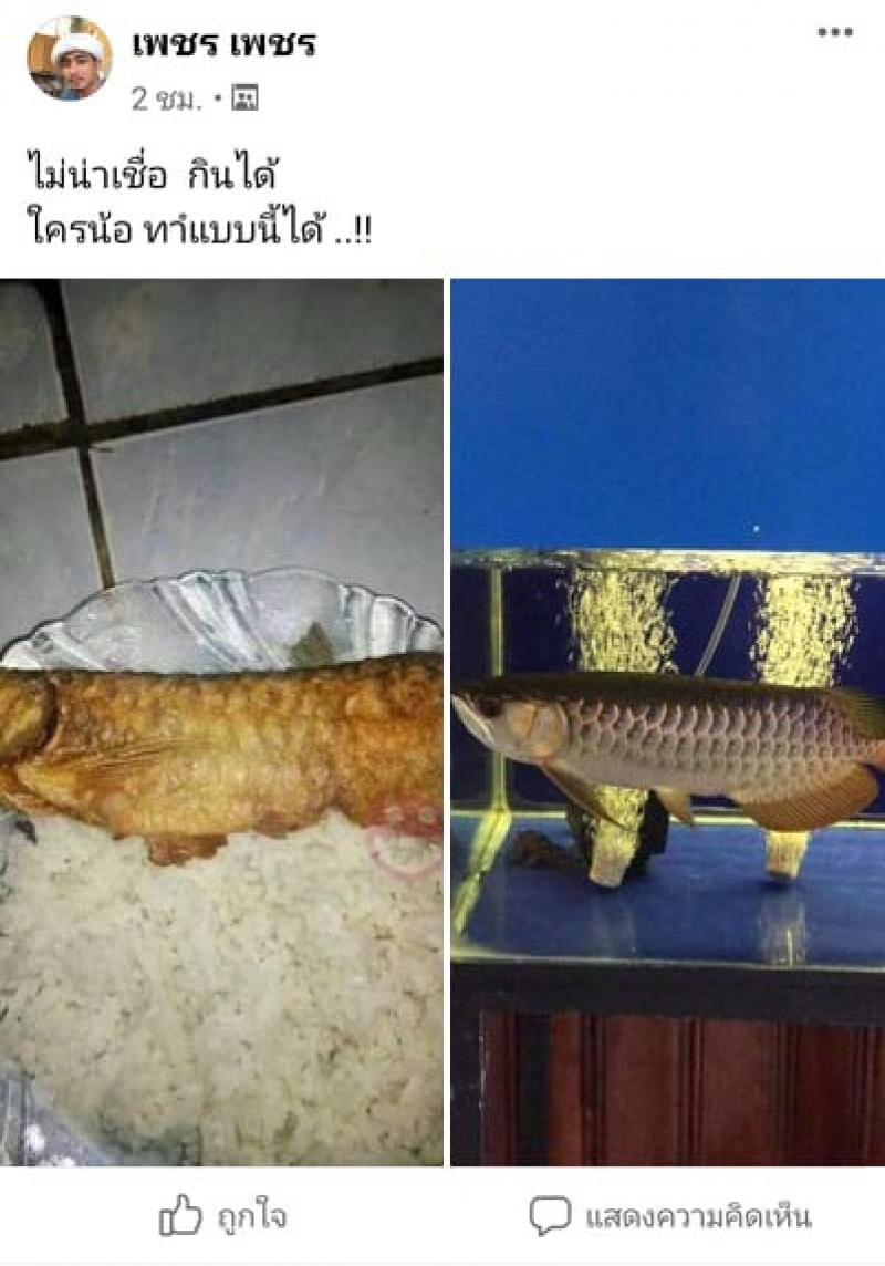 โดยได้มีผู้ใช้เฟซบุ๊ครายหนึ่งได้โพสต์อาหารสุดเเหวกเเนว ราคาคงไม่ธรรมดาเเน่นอน ด้วยการเอาปลามังกร หรืออะโรวาน่า นำมาทอดกินมันซะเลย ไม่น่าเชื่อ ใครหนอ ทำเเบบนี้ไปได้ ตัวใหญ่เต็มจานเลย เคียงคู่มากับข้าวสวยพร้อมรับประทาน