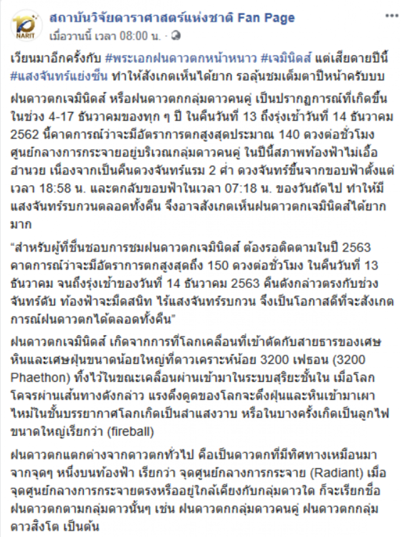 เมื่อวันที่ 12 ธันวาคม 62 เพจ สถาบันวิจัยดาราศาสตร์แห่งชาติ Fan Page ได้ออกมาโพสต์