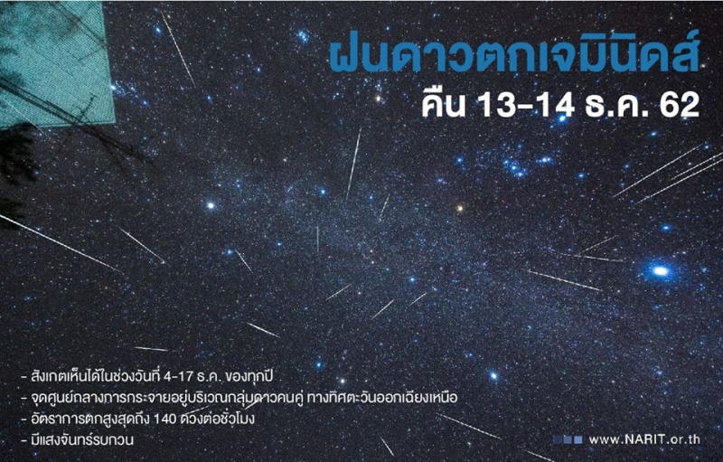 ฝนดาวตกเจมินิดส์ หรือฝนดาวตกกลุ่มดาวคนคู่ เป็นปรากฏการณ์ที่เกิดขึ้นในช่วง 4 ถึง 17 ธันวาคมของทุก ๆ ปี ในคืนวันที่ 13 ถึงรุ่งเช้าวันที่ 14 ธันวาคม 2562 นี้คาดการณ์ว่าจะมีอัตราการตกสูงสุดประมาณ 140 ดวงต่อชั่วโมง ศูนย์กลางการกระจายอยู่บริเวณกลุ่มดาวคนคู่ ในปีนี้สภาพท้องฟ้าไม่เอื้ออำนวย เนื่องจากเป็นคืนดวงจันทร์แรม 2 ค่ำ ดวงจันทร์ขึ้นจากขอบฟ้าตั้งแต่เวลา 18 58 น และตกลับขอบฟ้าในเวลา 07 18 น ของวันถัดไป ทำให้มีแสงจันทร์รบกวนตลอดทั้งคืน จึงอาจสังเกตเห็นฝนดาวตกเจมินิดส์ได้ยากมาก